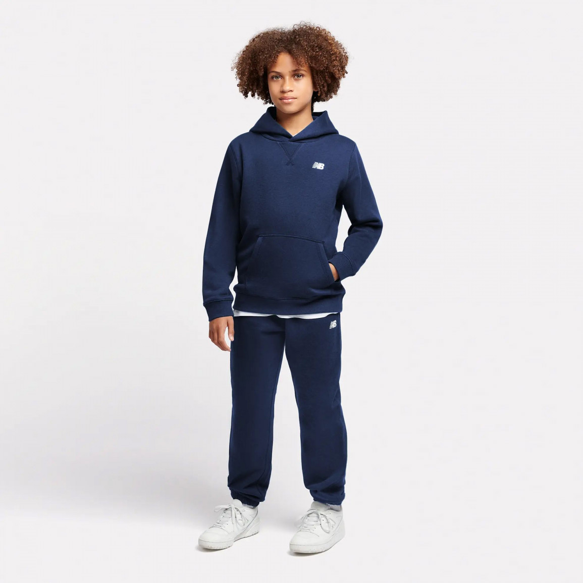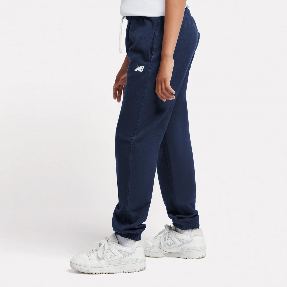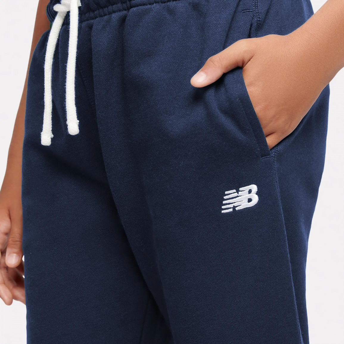 Детские брюки New Balance с небольшим логотипом NB, вышитым на левой штанине.