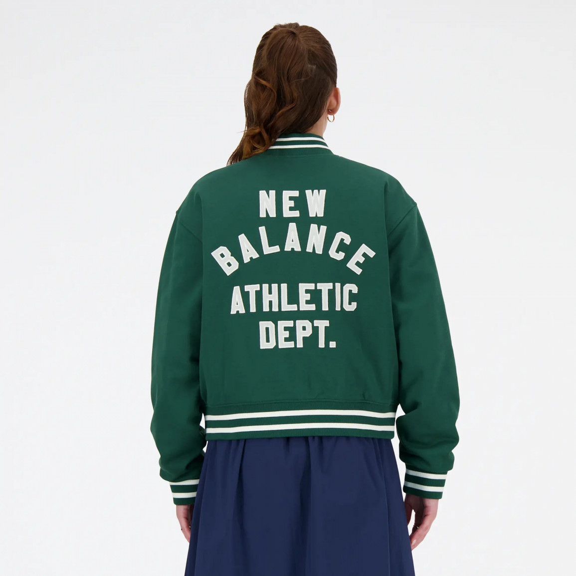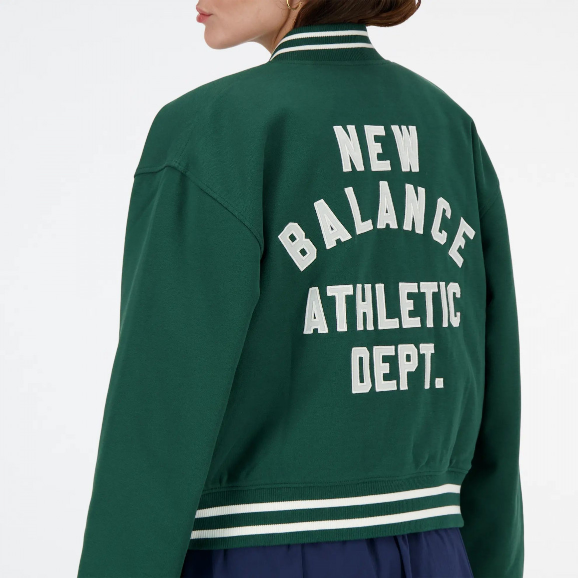 Легкая женская куртка New Balance. Одежду отличает надпись New Balance Athletic Dept, вышитая на спине.